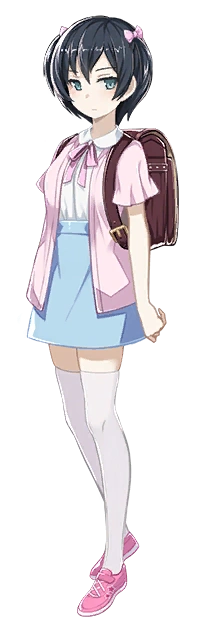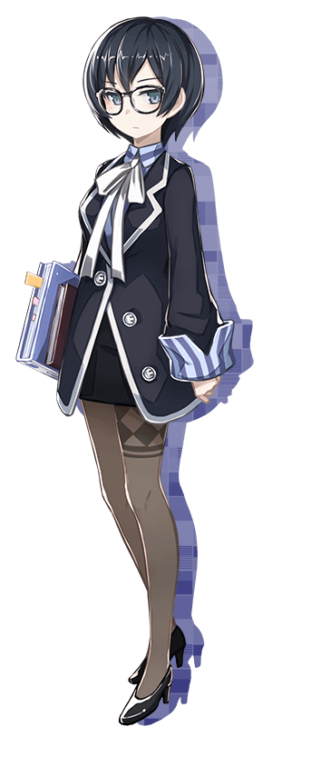 Rin is a petite woman who appears much younger than their actual age, being able to easily pass off as an elementary school student. She has blue eyes, and wears large glasses. She wears a blue collared shirt with a large white ribbon tied into a bow, she also wears a black pleated skirt with a dark blue coat with white accents that only has one button fastened. She wears pantyhose, with the left one having a checkerboard pattern that goes down to her thighs, and with black heels. She is always carrying a set of books with her.